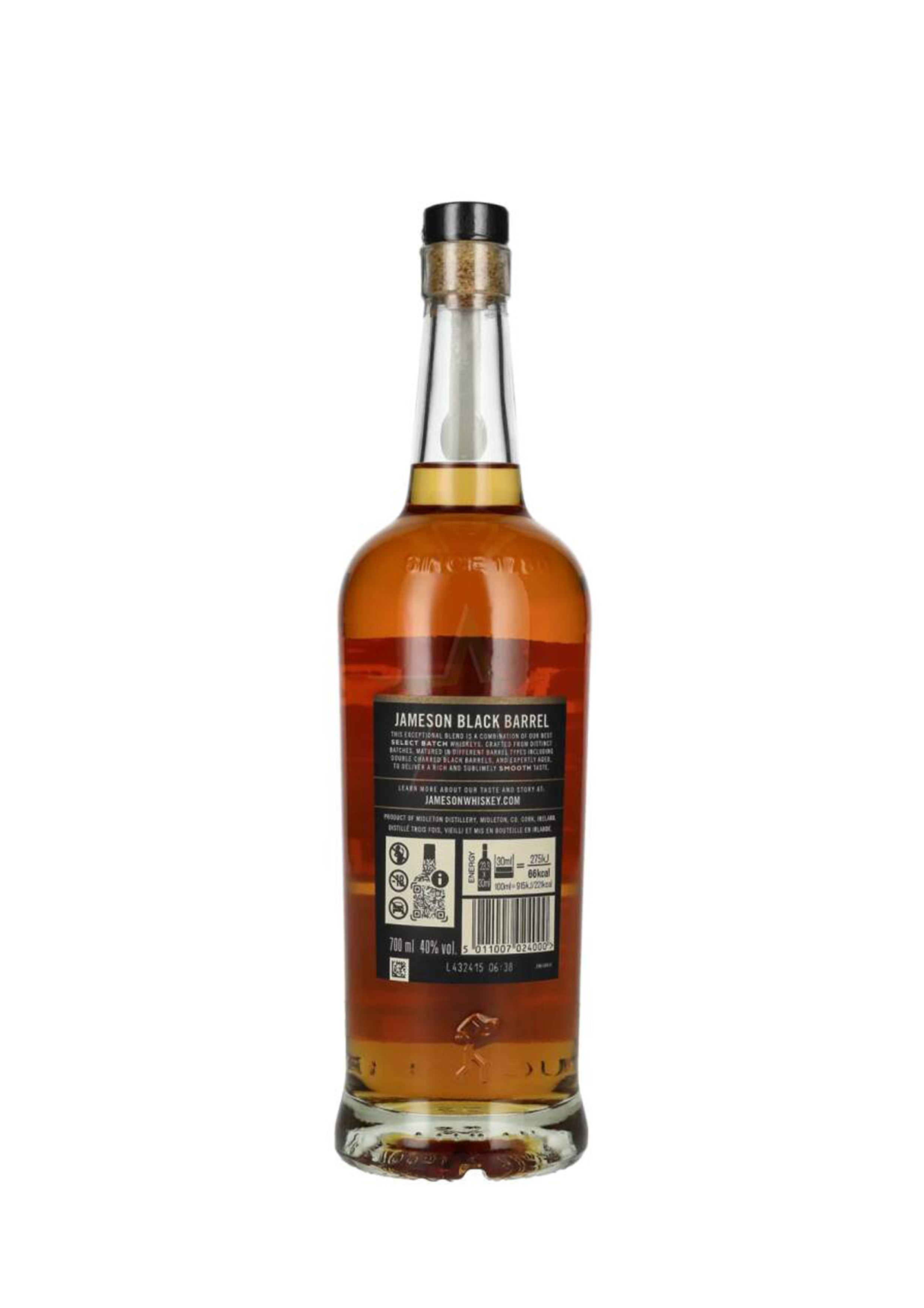Jameson Black Barrel è una variante premium del classico Jameson, caratterizzata dall'uso di un'alta percentuale di whiskey Pot Still doppiamente distillato e maturato in botti di ex-bourbon e sherry doppiamente tostate. Questo processo conferisce note più ricche e complesse, mantenendo la tipica morbidezza irlandese.
